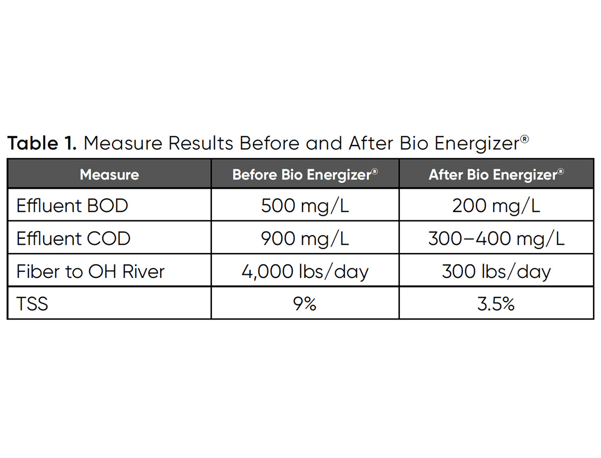Una instalación de aguas residuales de una fábrica de papel trataba diariamente 940 toneladas de bolsas de papel, cartón liner reciclado y medio ondulado. La fábrica estaba interesada en mejorar la eficacia operativa de las aguas residuales y reducir los gastos de explotación respecto a su uso estándar de polímeros. La planta experimentaba problemas de bacterias filamentosas, sólidos y bulking en el clarificador final. Vertía 4.000 libras de fibra al día en el río Ohio.