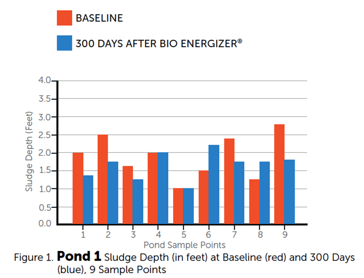 Se desarrolló una prueba de 6 meses (ampliada posteriormente a 300 días) en la que se administró Bio Energizer® para que los nutrientes estuvieran más disponibles para los microorganismos de las aguas residuales, estimulando así la reducción natural de los lodos. La prueba consistió inicialmente en tratar el Estanque 1 con una dosis de 7 ppm; sin embargo, durante el periodo de tratamiento el operador del sistema determinó que sería muy beneficioso tratar tanto el Estanque 1 como el Estanque 2, ya que el sistema de lagunas había utilizado históricamente utilizado Estanque 2 más que Estanque 1. La cantidad de dosificación se dividió entre los dos estanques, de modo que se administraron 2 ppm al estanque 1 y 3 ppm al estanque 2. Después de 6 meses, se administró 1 ppm al estanque 3 para facilita mayor reducción de lodos. La determinación de los lodos se realizó mensualmente y se hizo un seguimiento de los niveles de lodos en 9 puntos de recogida de 3 secciones transversales para seguir la reducción de lodos en cada sistema.