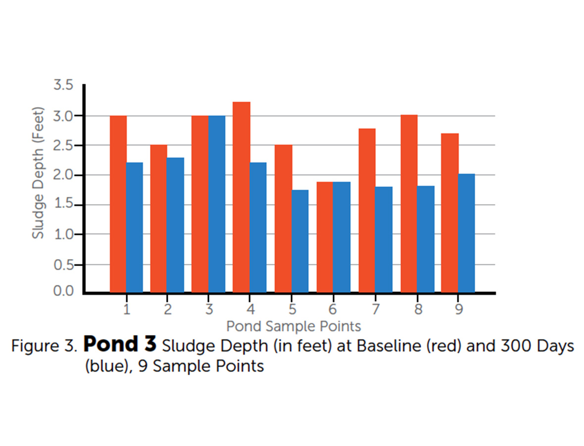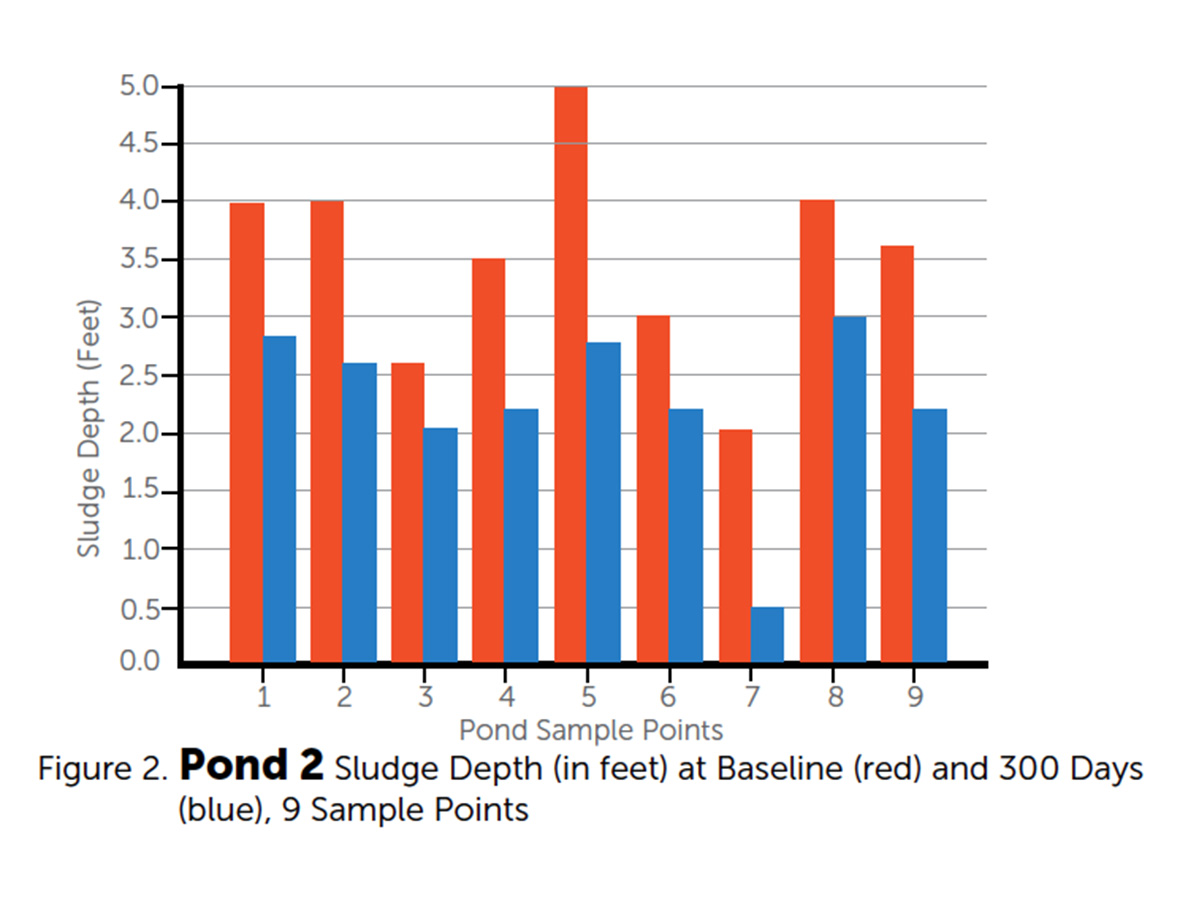 A los 10 meses se comprobó que la profundidad media de los lodos de los estanques se había reducido continuamente: El estanque 1 de una profundidad media de 1,9 pies a 1,6 pies, una reducción del 12%; el estanque 2 de una profundidad media de 3,5 pies a 2,3 pies, una reducción del 36%; y el estanque 3 de una profundidad media de 2,7 pies a 2,1 pies, una reducción del 24%. El efecto acumulativo fue demostrado cuando el foco del tratamiento cambió del Estanque 1 al Estanque 2 y al Estanque 3. Basándose en la reducción progresiva de 300 díasSe estima que se seguirá reduciendo el lodo con el uso continuado del producto. Al reducir los sólidos acumulados en sus lagunas, la ciudad está recuperando las pérdidas capacidad para manejar mejor el caudal entrante y cumplir los requisitos de su permiso sin necesidad de dragado.