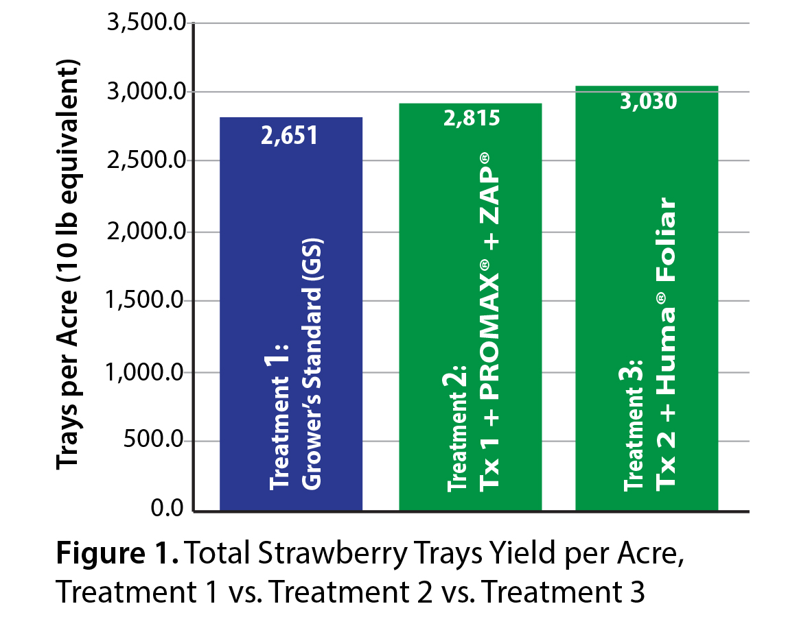 Este ensayo de campo evaluó los efectos de Promax® y Zap® además de la fumigación -más adicional aplicaciones foliares adicionales de 4 productos fertilizantes Huma® en el rendimiento de las fresas Portola, en comparación con el programa estándar de nutrición de cultivos del agricultor.