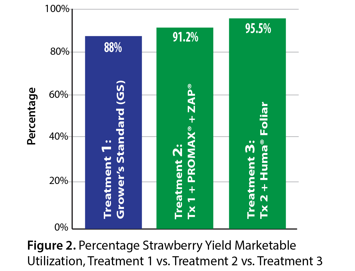 La Figura 2 muestra la utilización diaria en el mercado de las bayas recogidas durante la temporada (el porcentaje de bayas comercializables del peso total de bayas recogidas), con el Tratamiento 3 (Huma®) resultando en una utilización del 95,5% y el Tratamiento 1 (Estándar del Cultivador) alcanzando sólo el 88%. Esto representa más de 561 libras adicionales de bayas por acre que pueden venderse gracias al Tratamiento 3 (Huma®).