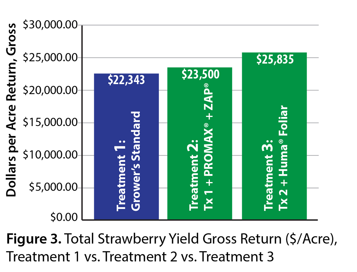 Como puede verse en la Figura 1, el Tratamiento 3 (Huma®) produjo la mayor cantidad de bandejas de fresas recolectadas (equivalente a 10 lb), con un total acumulado de 3.030 bandejas por acre equivalente, en comparación con el Tratamiento 1 (Estándar del cultivador) de 2.651 bandejas por acre, lo que supone un aumento del rendimiento del 14% para Huma®.