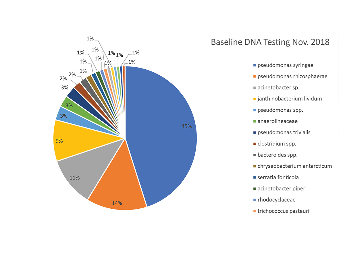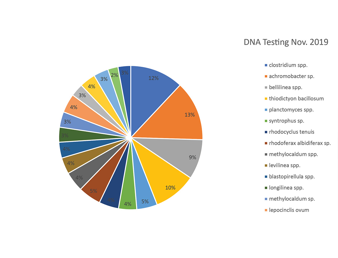 Mediante el análisis del ATP, se descubrió que la capa de lodo del fondo era la capa biológicamente más activa de las lagunas, lo que refuta la idea de que la capa de lodo es inerte y sólo puede eliminarse mecánicamente. Los análisis de ADN permitieron establecer una tendencia de 47 de las principales bacterias diferentes durante los muestreos trimestrales, de entre los cientos de bacterias presentes en las dos lagunas. En febrero de 2019, las bacterias empezaron a seleccionar de forma natural hacia la DBO y la consumo de fósforo bacterias. Las bacterias acumuladoras de fósforo que no estaban presentes durante el análisis de referencia ganaron protagonismo durante el tratamiento, lo cual era inesperado, ya que las lagunas no son conocidas por la eliminación de fósforo. Como era de esperar, el trabajo de reducción de los lodos lo realizaron diversas bacterias anaerobias.