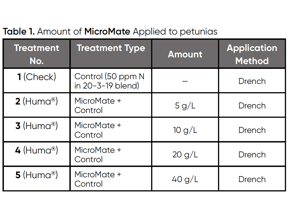 Acelerar el momento de madurez de las flores y tener más flores en las plantas ornamentales comerciales las hará más comercializables y ayudará a los floricultores a producir más plantas de flor en maceta al año. El objetivo de este estudio era evaluar los efectos de un producto húmico natural de Huma® llamado Micromate sobre la velocidad de maduración y el número de flores de las petunias.