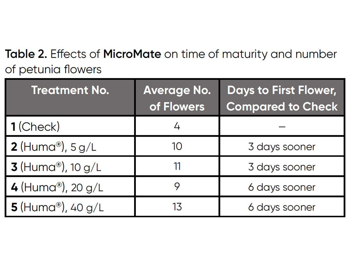El Huma MicroMate La suspensión líquida húmica mejoró la tasa de maduración y aumentó el número de flores en las plantas de petunia (Foto 1). Generalmente, las cantidades más elevadas de MicroMate contribuyó a una maduración más rápida y a un mayor número de flores en la petunia. MicroMate aplicado a 40 g/L aceleró más la floración (6 días antes) y produjo el mayor número medio de flores (13). Véase la Tabla 2.