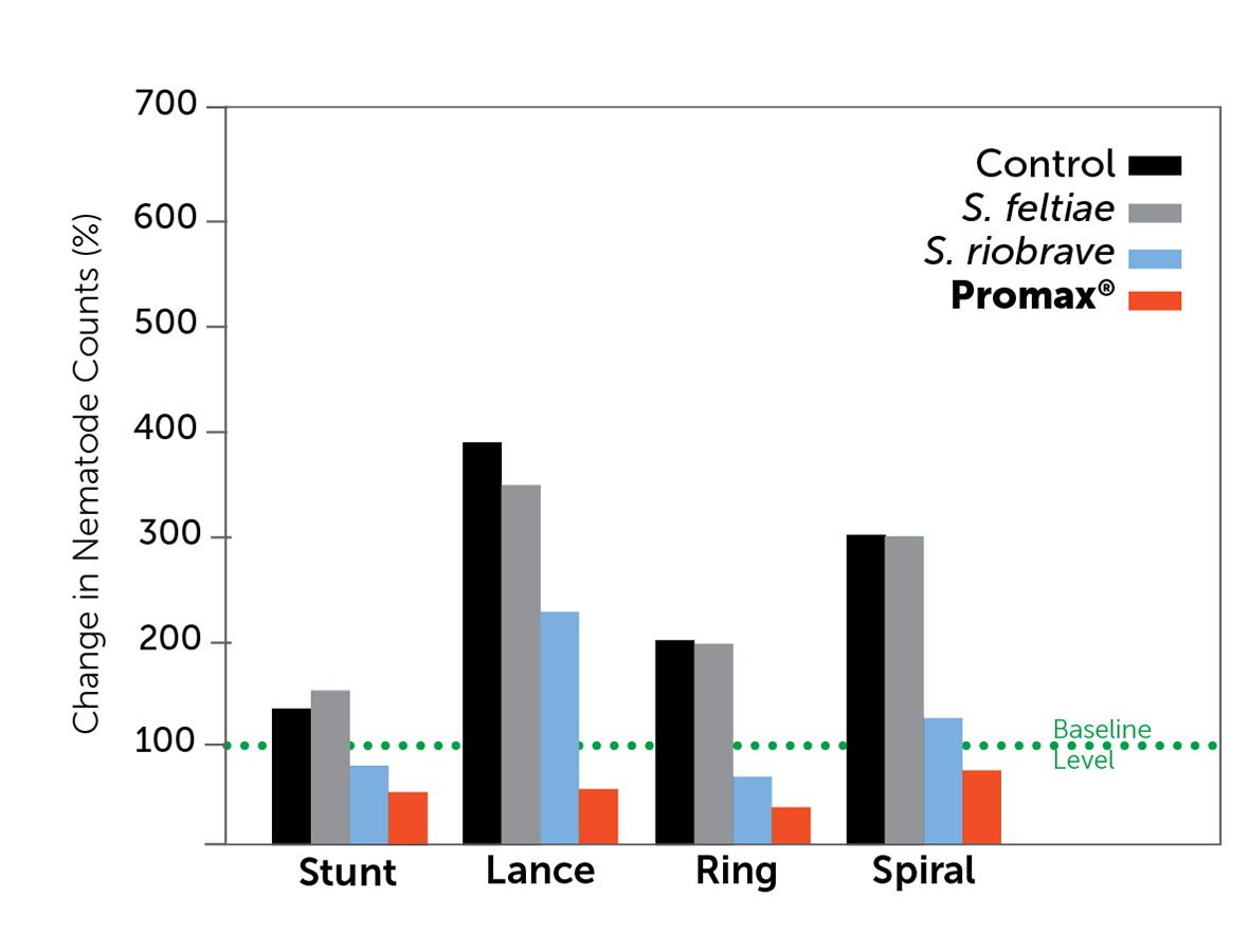 Los resultados comunicados en este ensayo demuestran que la aplicación de 1 tratamiento del nematicida Promax® redujo los porcentajes de población de los 4 nematodos fitoparásitos estudiados tanto a los 7 días como a los 30 días post-tratamiento en los años 1 y 2, siendo Promax® más eficaz que los otros 2 tratamientos estudiados en ambos periodos de tiempo.