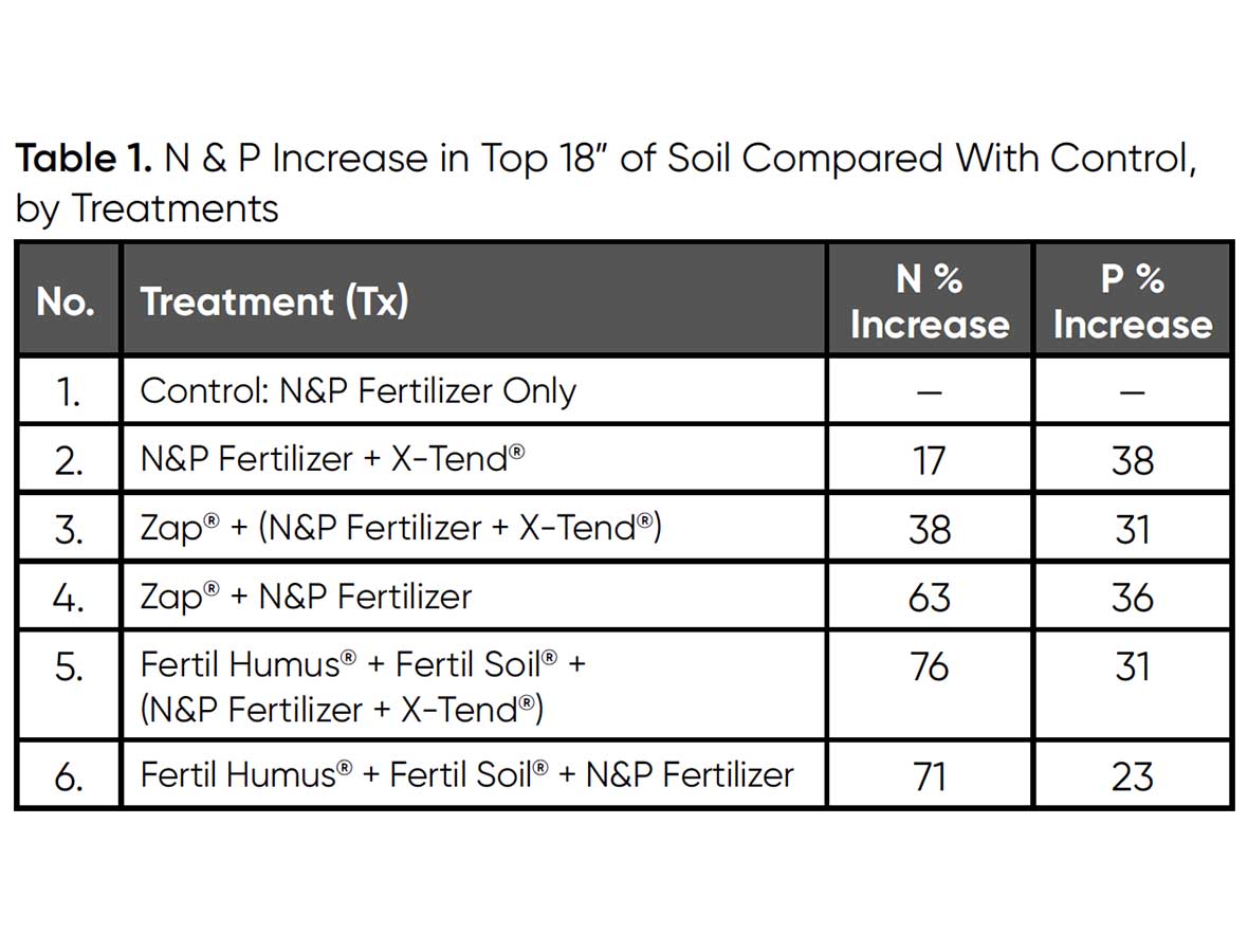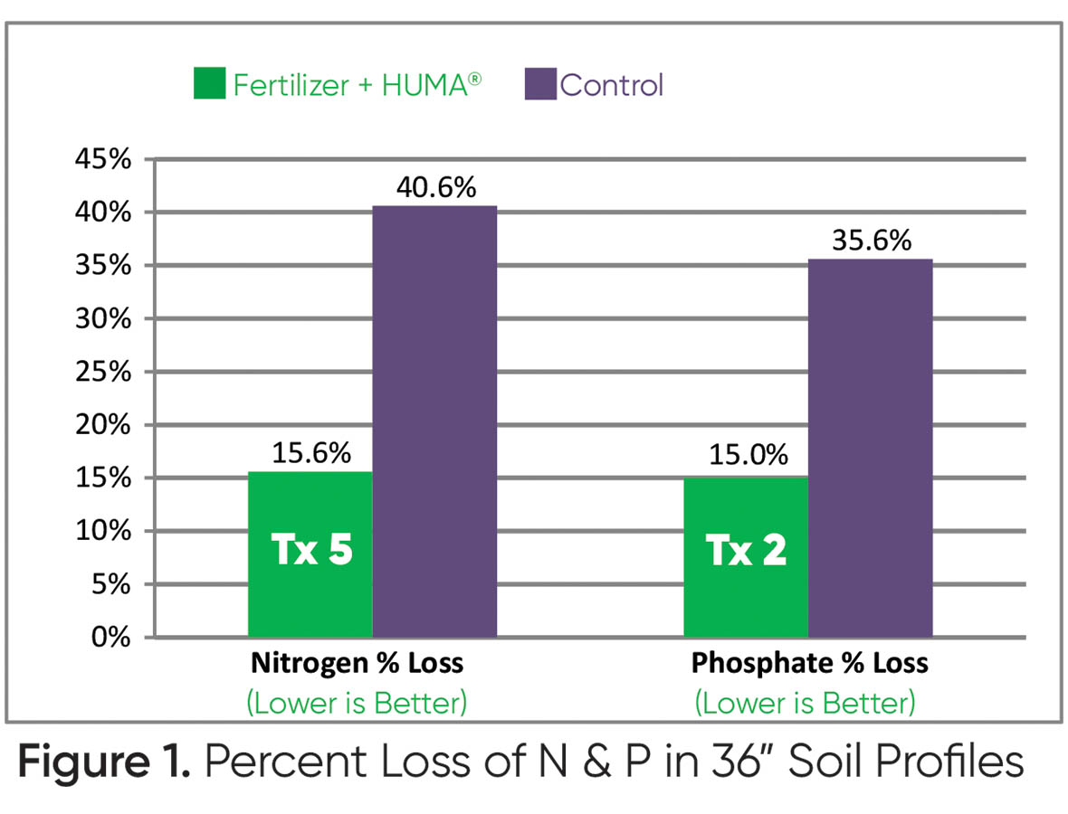 Com a complexificação do fertilizante com o X-Tend® e a adição dos corretivos de solo Huma® (Fertil Humus®, Fertil Soil® e Zap®), a lixiviação foi reduzida  e mais nitrogênio e fosfato permaneceram nos 18″ superiores do solo.