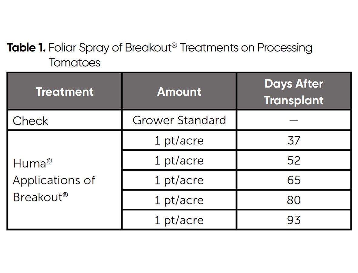 Neste estudo, o produto de controle de crescimento Breakout® da Huma® foi avaliado em termos de seus efeitos sobre o rendimento e a qualidade dos tomates para processamento.