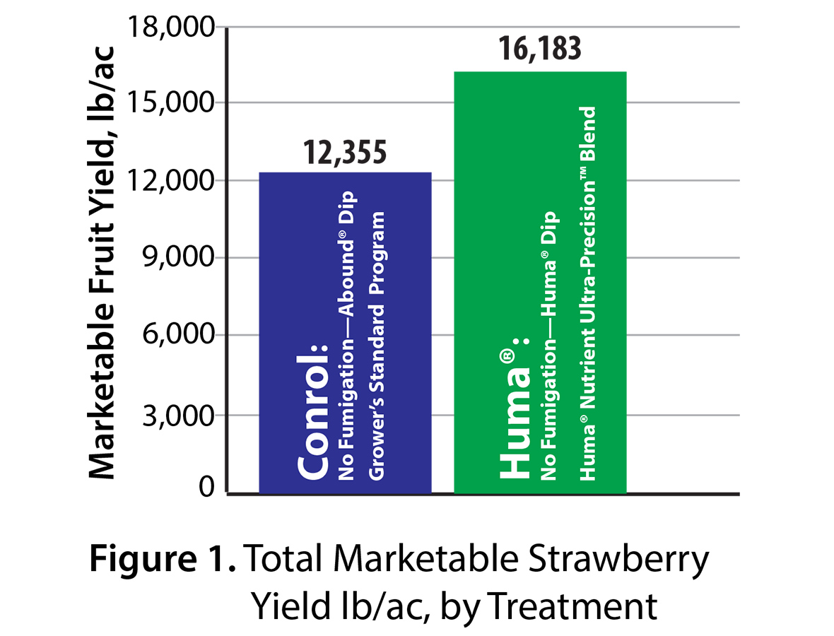 O tratamento com o fertilizante Huma® e UPB produziu 30% mais morangos comercializáveis do que o programa de fertilizantes padrão do produtor.