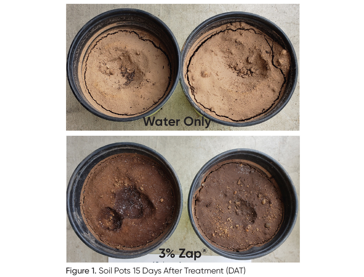 Quinze dias após o tratamento (DAT), o solo tratado com solução de Zap® a 3% parecia muito mais úmido do que o solo tratado com água (Figura 1).