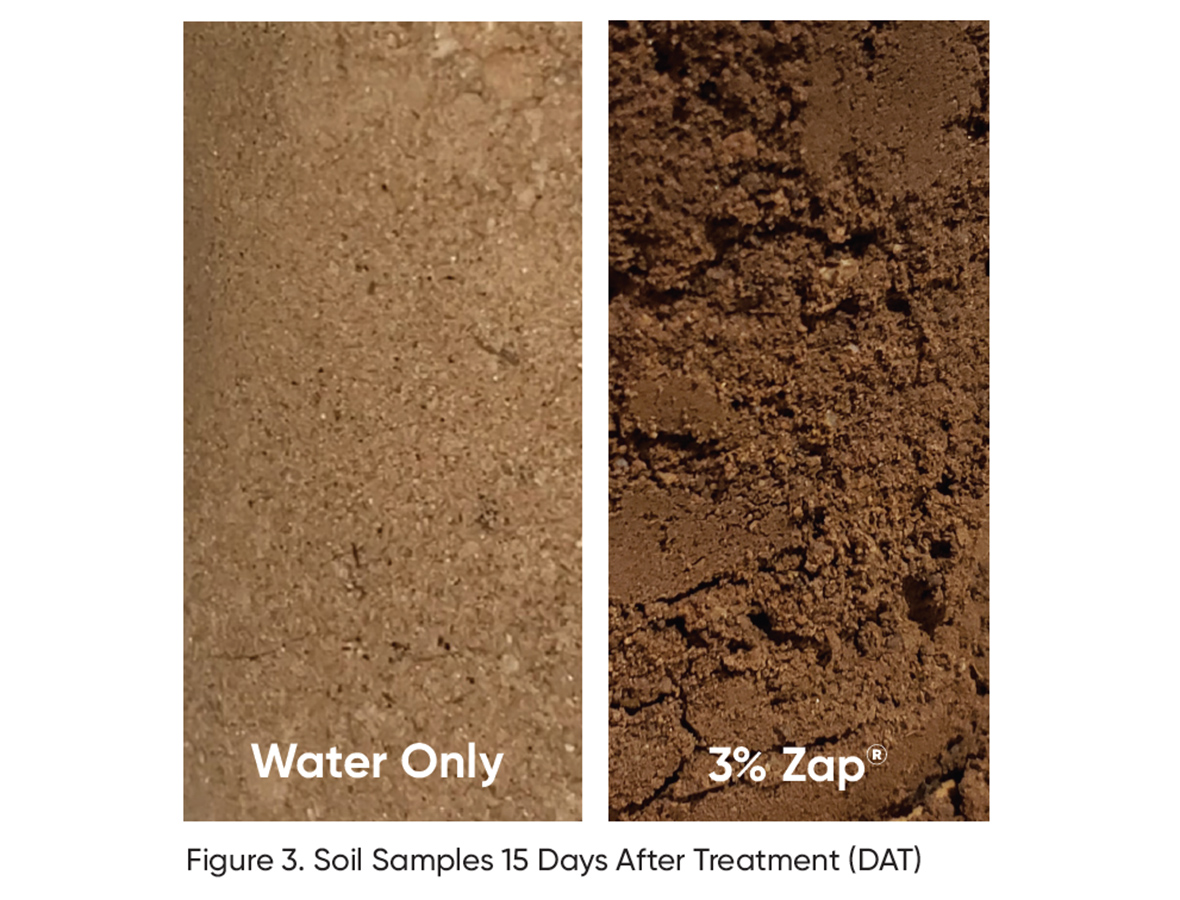 O solo tratado com 3% de Zap® parecia mais estruturado, poroso e menos compactado do que o solo tratado apenas com água (Figura 3).