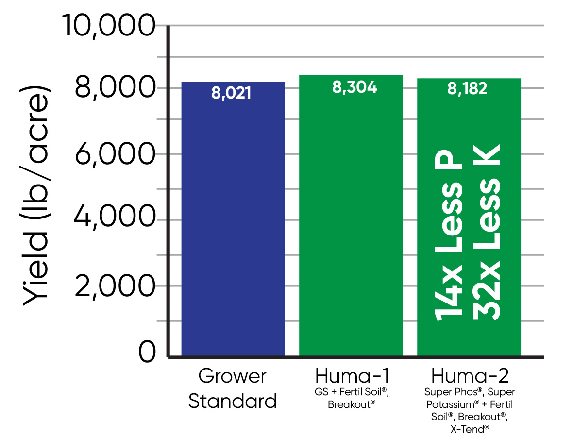 A adição dos produtos Fertil Soil® e Breakout® da Huma® no plantio e a substituição completa de TSP e MOP por 14 vezes menos P na forma de Super Phos® e 32 vezes menos K na forma de Super Potassium®, além do aprimoramento do UAN-32 com X-Tend®, mantiveram ou melhoraram a produção e a qualidade da cana-de-açúcar (níveis de Brix e sacarose) com uma vantagem de renda líquida de US$ 40/acre (Huma-1) e US$ 43,84 (Huma-2) em relação ao programa de fertilizantes padrão do produtor.