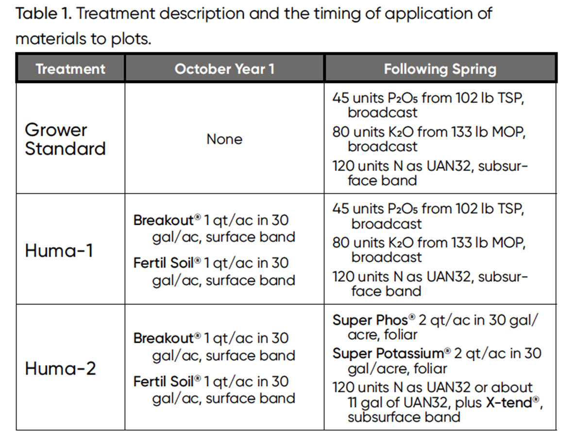 Cerca de 1,5 mês após o plantio, em 1º de outubro, um conjunto de parcelas (Huma-1) recebeu os produtos Huma® Fertil Soil® (1 qt/acre) mais Breakout® (1 qt/acre) pelo método de difusão superficial (Tabela 1).