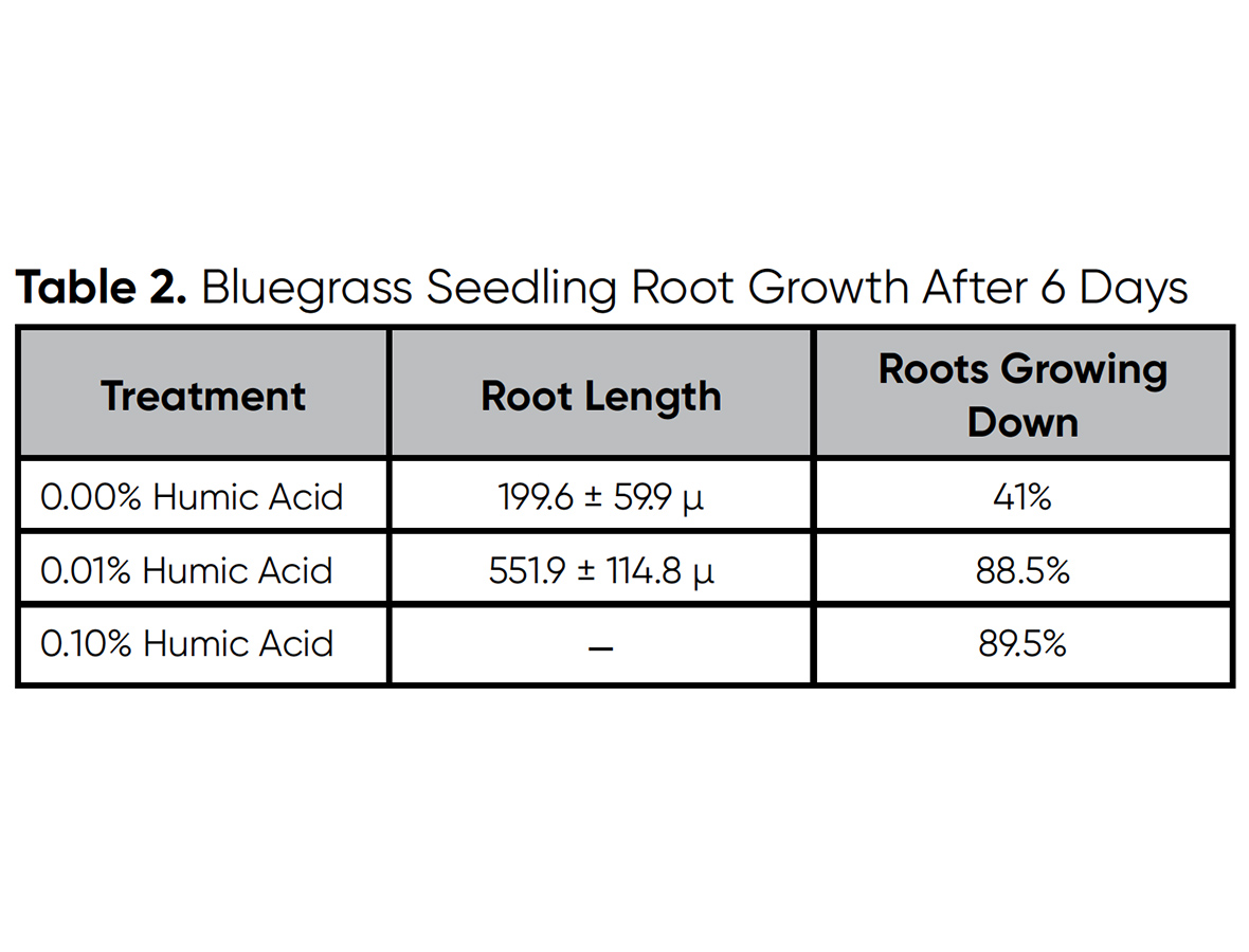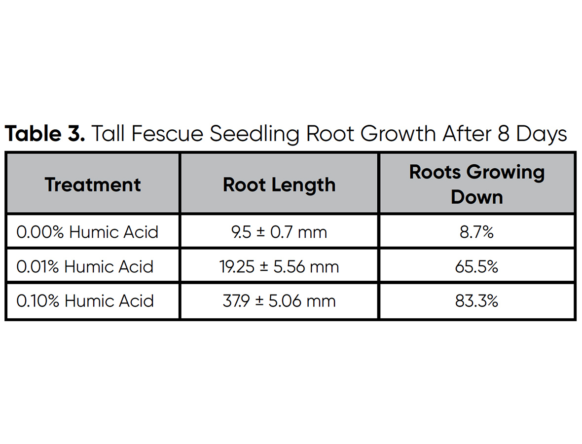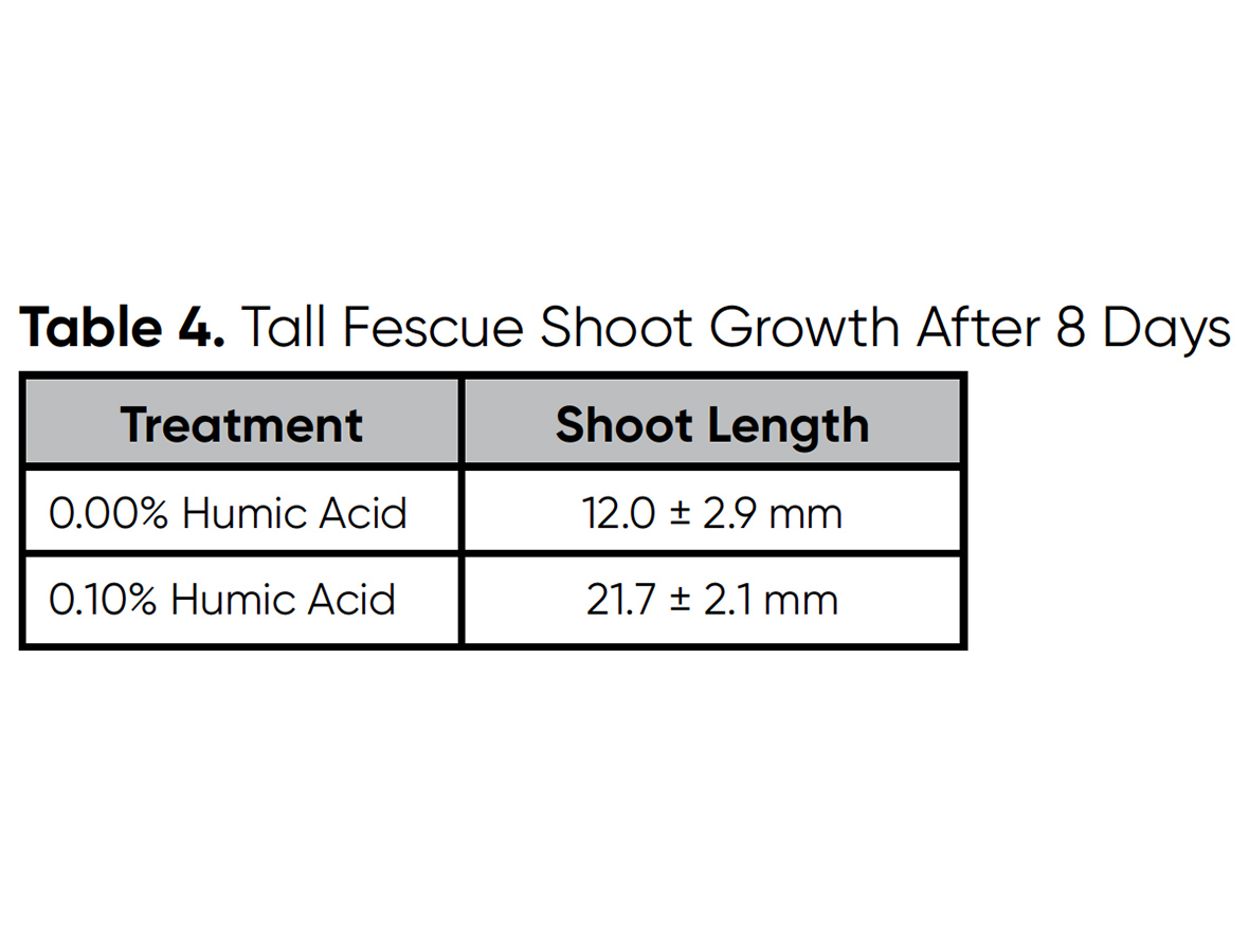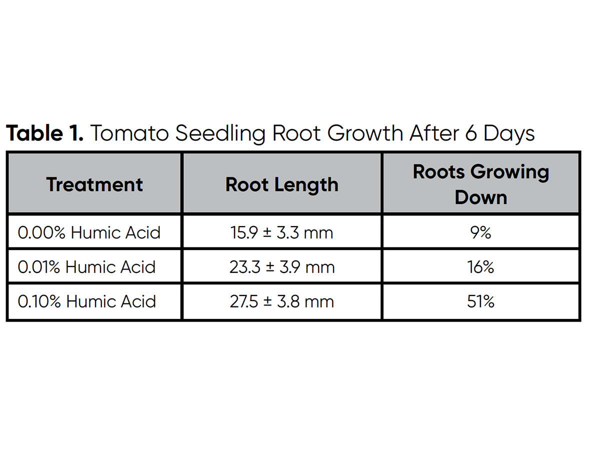 O Huma Pro®, um ácido húmico líquido a 6%, foi incorporado à agarose em concentrações de 0%, 0,01% e 0,10% de ácidos húmicos. Sementes de plantas altas fescure(Poa annua) e o tomate beefsteak foram desinfetados superficialmente em 3% de NaOCl por 30 minutos para reduzir a carga microbiana nas mudas. As sementes foram germinadas e cultivadas por 6 dias em agarose (um polissacarídeo derivado de algas marinhas) com e sem o produto Huma®