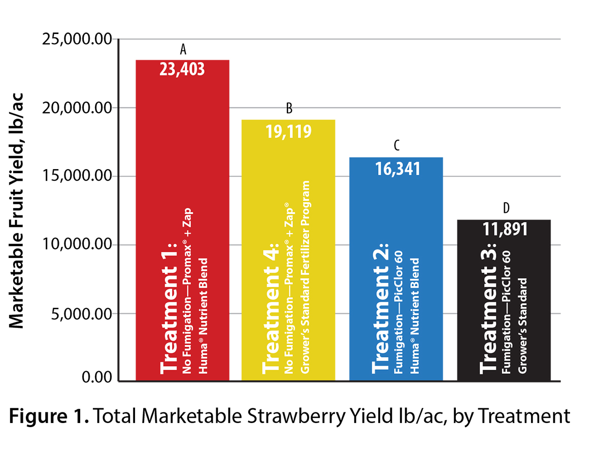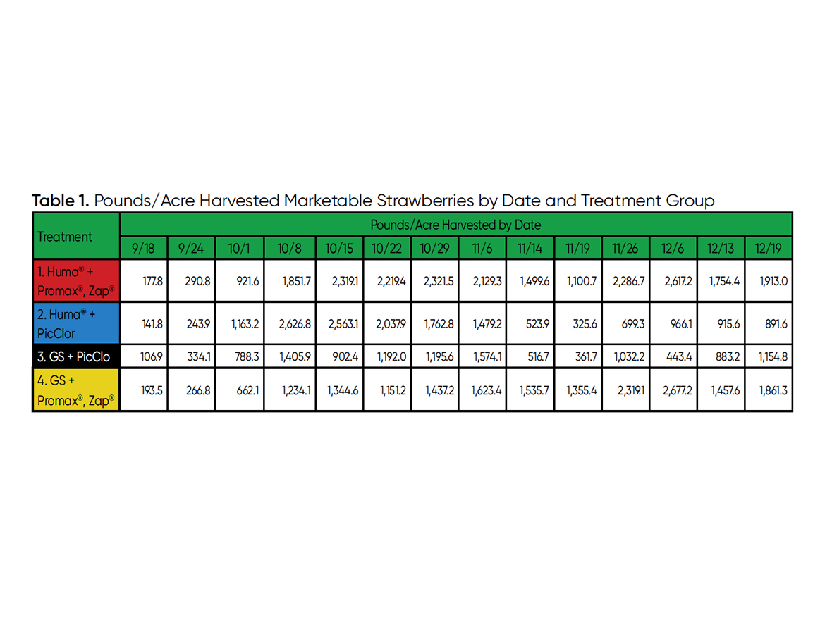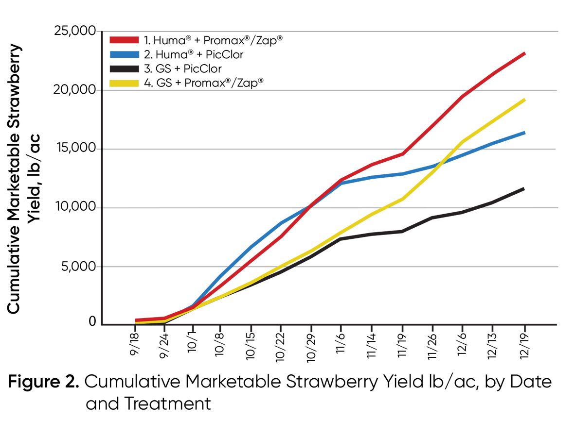 Esse estudo e outros demonstram que o uso do Huma® Promax® e do Zap® pode alcançar altas produtividades nos morangos Portola na Califórnia, mesmo sem a fumigação tradicional.