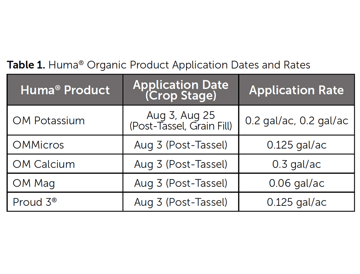 O produtor recebeu 4 produtos Huma® listados pela OMRI, pré-misturados para aplicação no estágio de crescimento pós-tassel na parcela de teste.